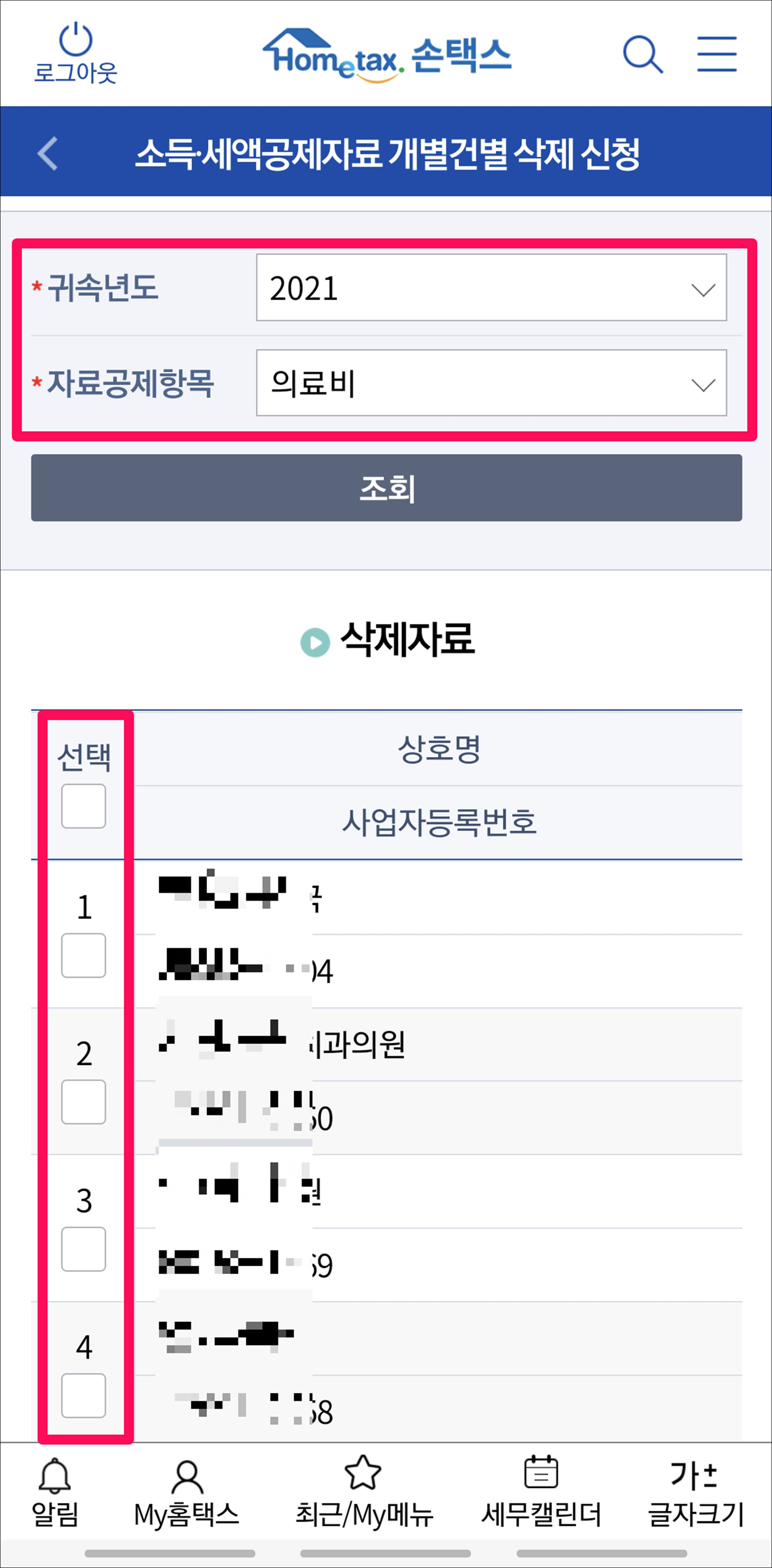 ③ 귀속년도와 원하는 항목을 선택하고 아래 검색결과에서 삭제를 원하는 항목 좌측에 체크표시를 선택합니다.