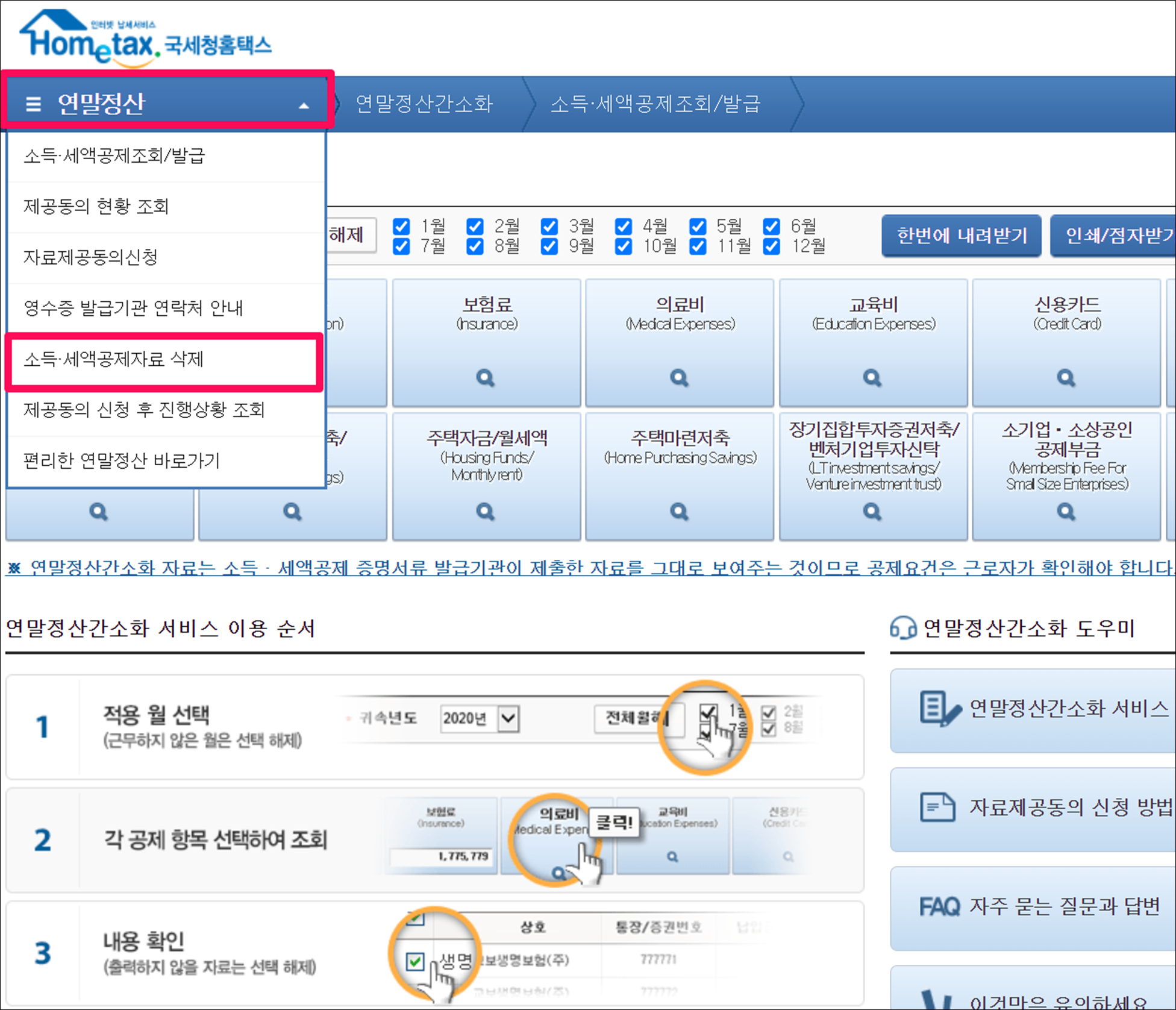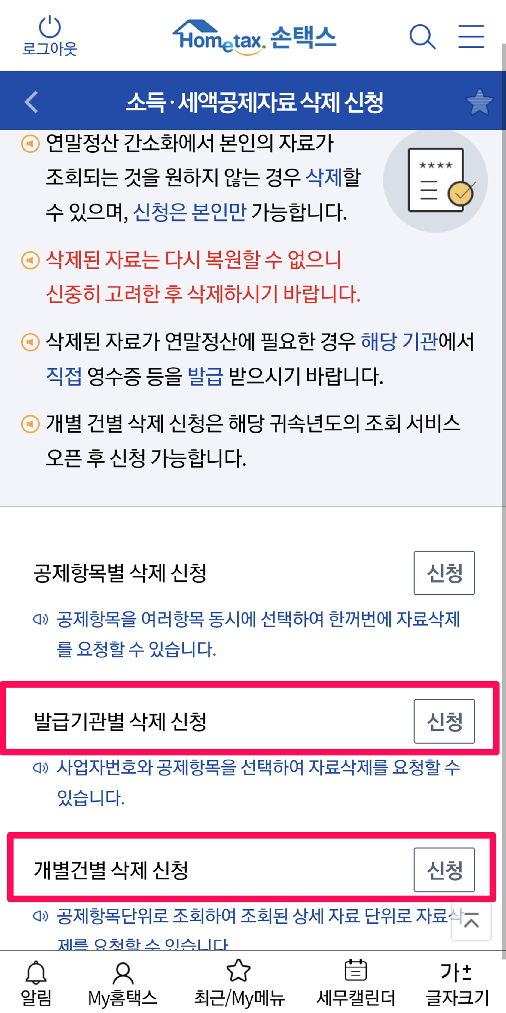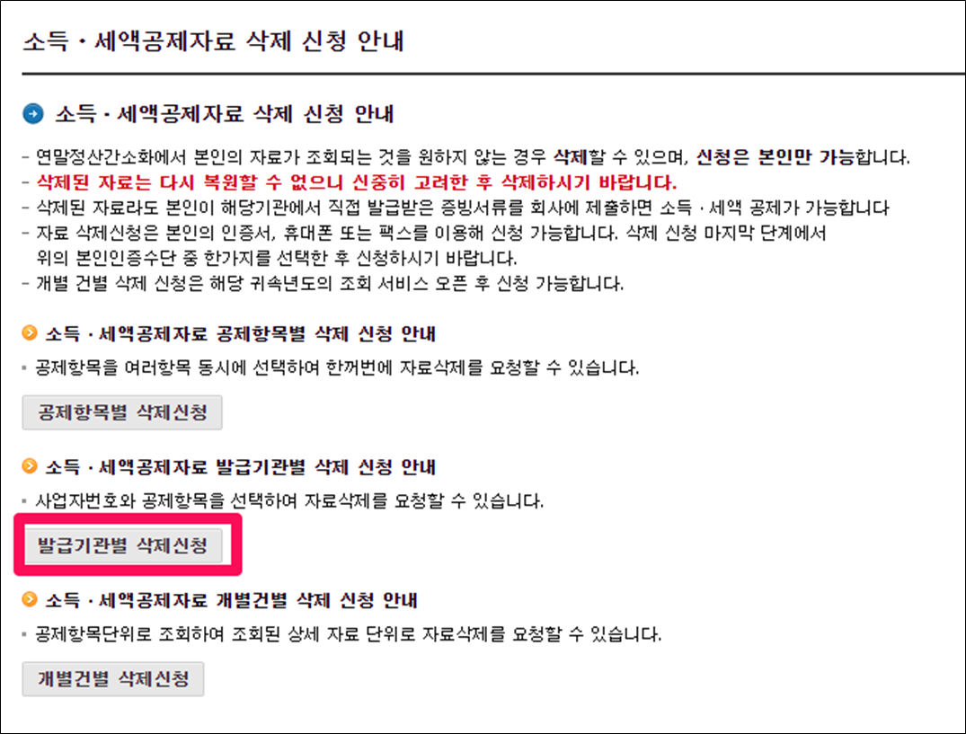 1) 로그인 → 연말정산 → 소득/세액공제자료 삭제→ 발급기관별 삭제신청을 선택합니다.
