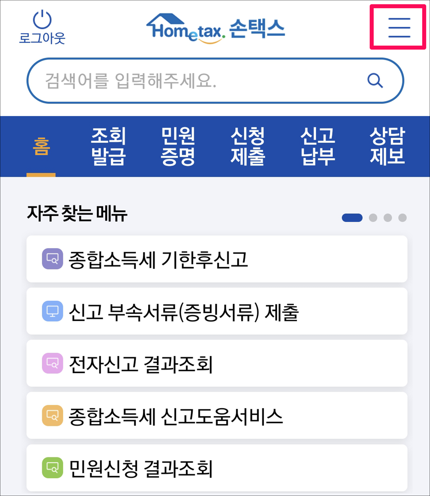 ▼ 손택스 상단 우측의 줄 세 개를 선택합니다.