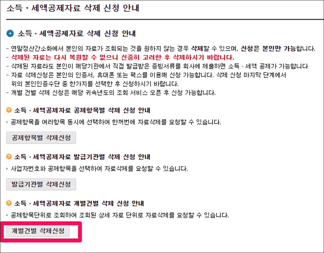 1) 로그인 → 연말정산 → 소득/세액공제자료 삭제 → 개별건별 삭제신청을 선택합니다.