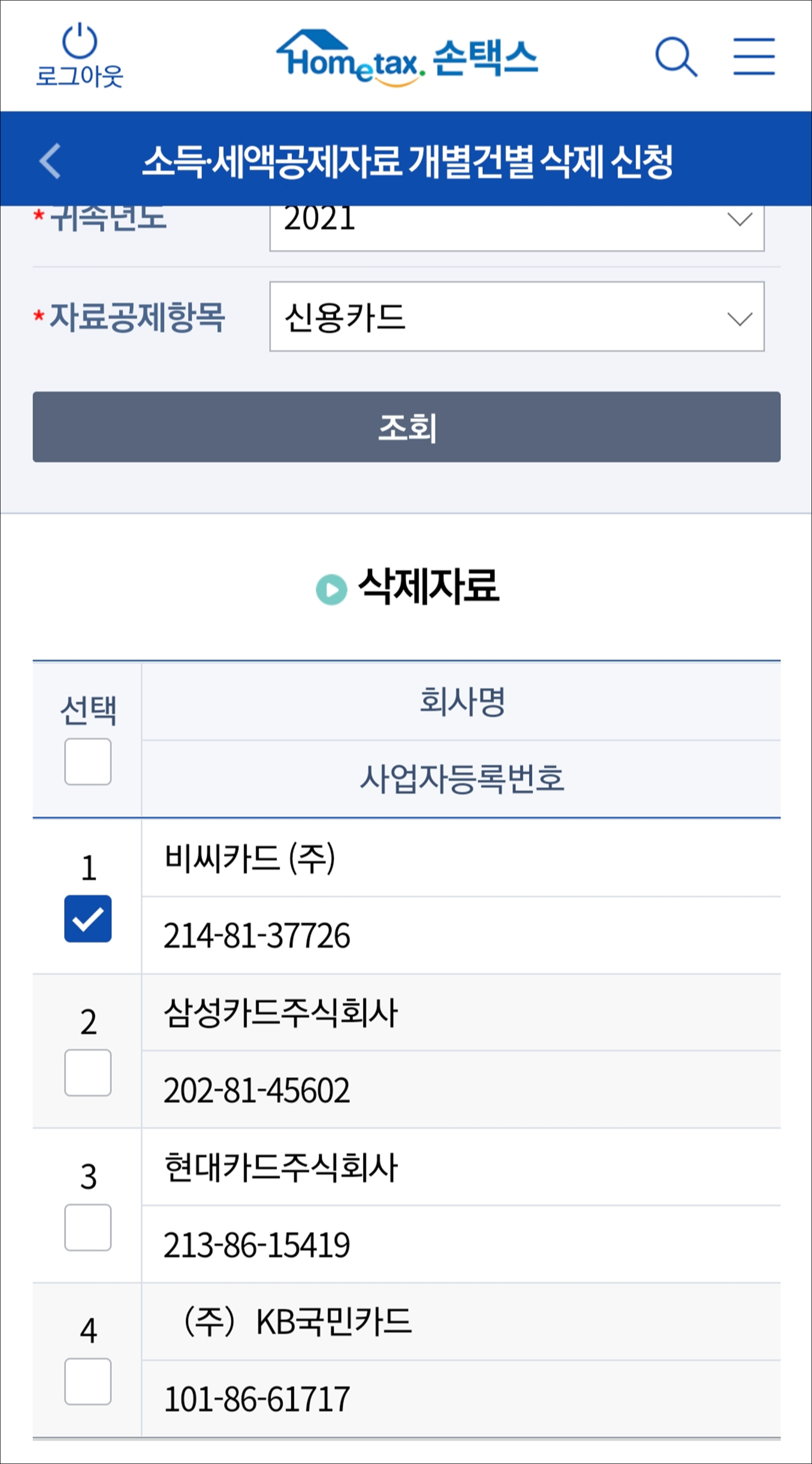 귀속년도를 선택하고 자료공제항목에서 신용카드를 선택한 후 조회하기를 클릭합니다. 카드사별로 쭉 나오는데 이 중에 원하는 카드사를 선택해서 신청하시면 됩니다.