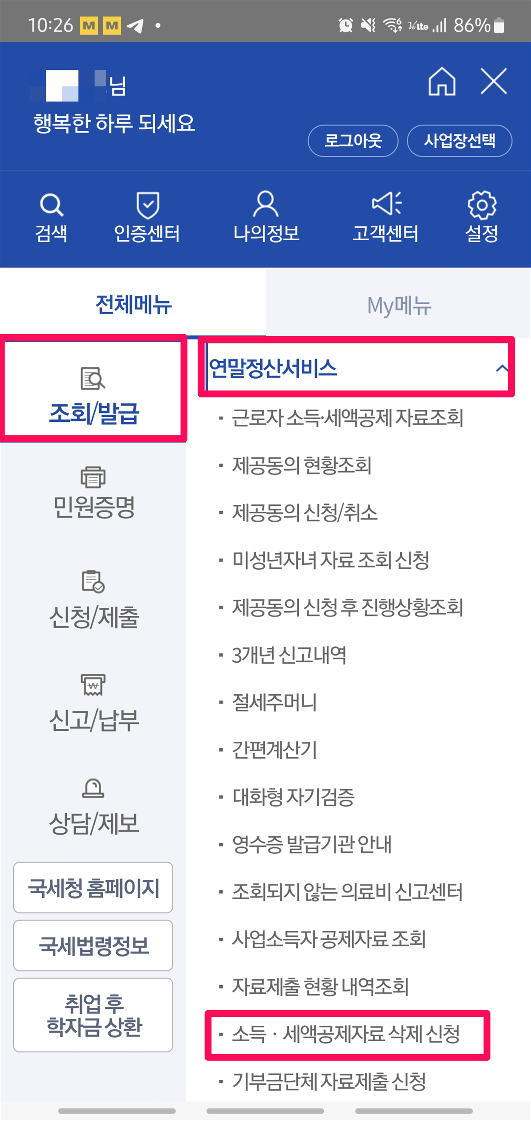 ▼ 조회/발급 → 연말정산서비스 → 소득/세액 공제자료 삭제신청을 선택합니다.
